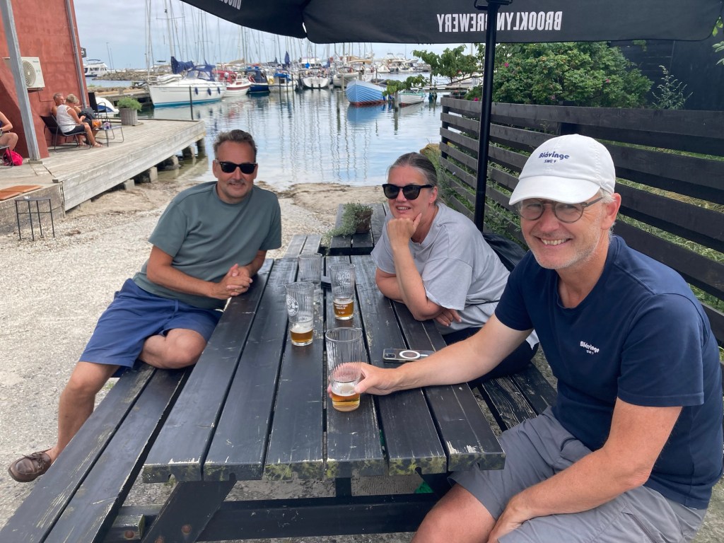 Just när vi lagt till utanpå en dansk Hallberg Rassy kom regnet smattrande. Vi reste sittbrunnstältet och firande tilläggningen med öl, vin och ostar. Sedan blev det bypromenader och hårtvättsbad från bryggan på utsidan piren.
