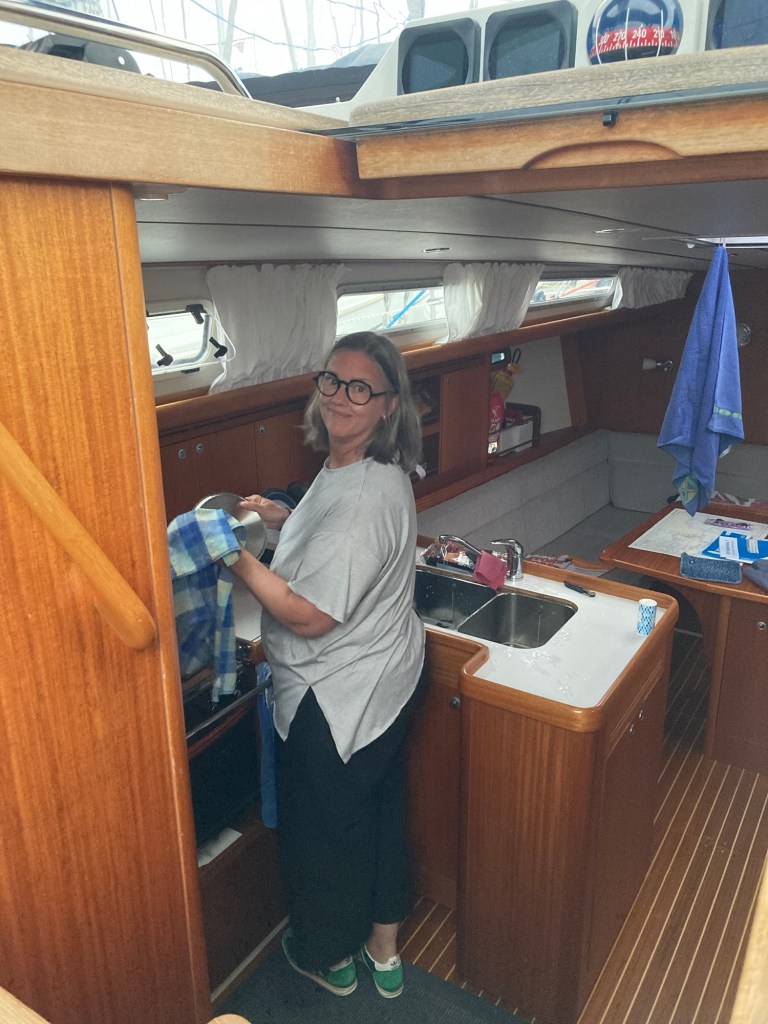 Kapten sover middag på fördäckVejerø från hållNybadad på LangørJohan skrubbar vattenlinjen och för samtidigt djuplodande samtal med båtgrannen Blåvinge på utsidan den lilla lilla hamnenAnnika och Jonas vaktar båtenÄntligen torskfrikadeller (”torskedeller”) – som vi har sett fram mot denna måltid!Avslutad middag och en grundgådd folkbåt i bakgrunden