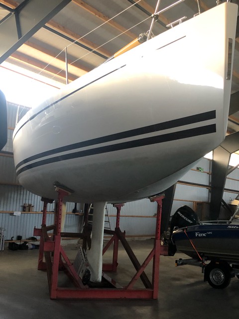 Bottenputs. Måla i fläckar med epoxi – två lager och bottenmåla. Fixat under påsken. Tidigare grundmålning har en tendens att släppa mot topcoaten. Kommer att kräva större insats något år. Men botten är ändå i ett helt ok skick.