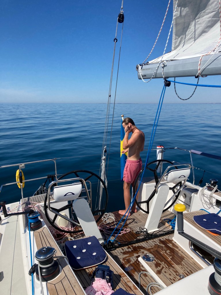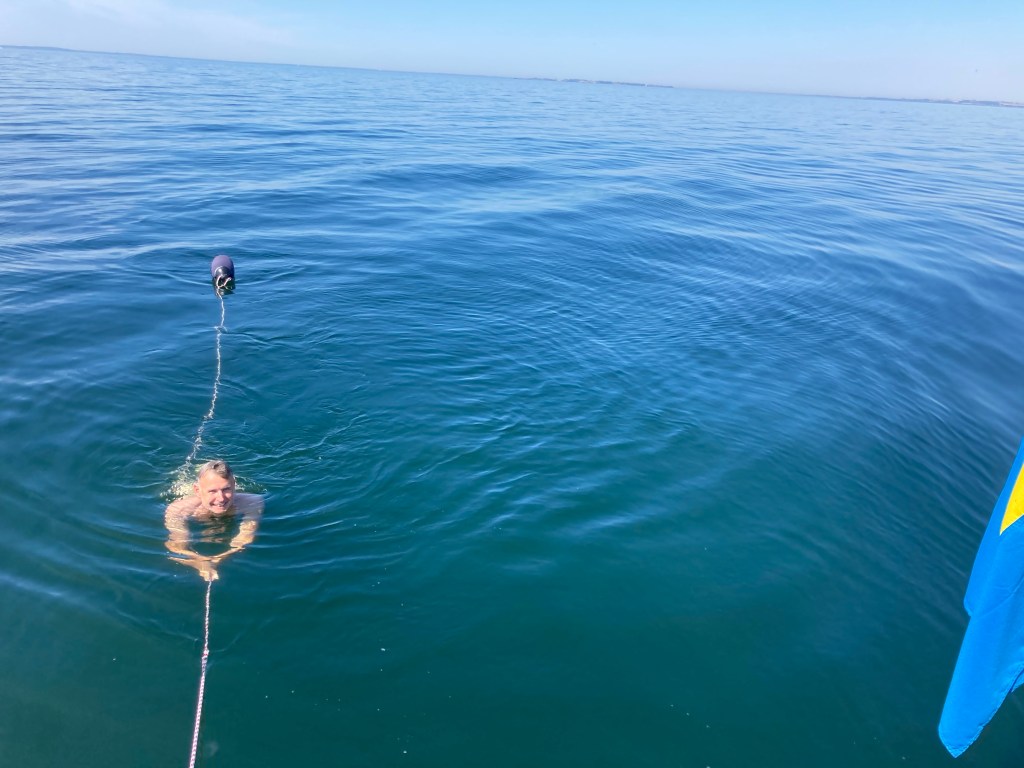 Lördagen började vi med dopp på den närliggande stranden och därpå segling i mycket svag vind som gick och avslutande motorgång till Rödvig. En härlig dag som hade mer karaktären av sommar än höst!